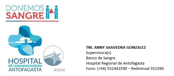Estimados junto con saludar se informa subrogancia de Dra. Pamela Bustamante Acevedo, Jefa de unidad Banco de sangre, quien se encontrara con feriado legal del 16/09 al 02/10.