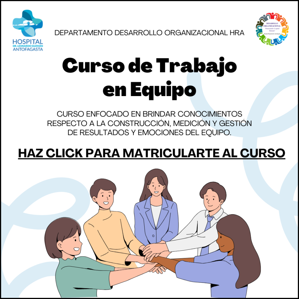 Estimada comunidad hospitalaria, junto con saludar, como Departamento de Desarrollo Organizacional nos complace anunciar el curso online asincrónico de trabajo en equipo, confeccionado por profesionales de Desarrollo Organizacional, con el apoyo del Departamento de Capacitación.
