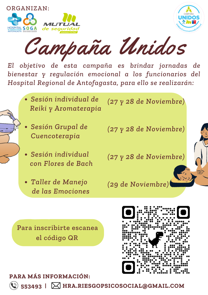 La iniciativa tiene como objetivo brindar jornadas de bienestar a funcionarios/as del HRA y consta de la realización de talleres de Reiki y Aromaterapia, Cuentoterapia, Flores de Bach y Manejo de las Emociones, abiertos a todos los funcionarios/as pertenecientes al Hospital Regional de Antofagasta.
