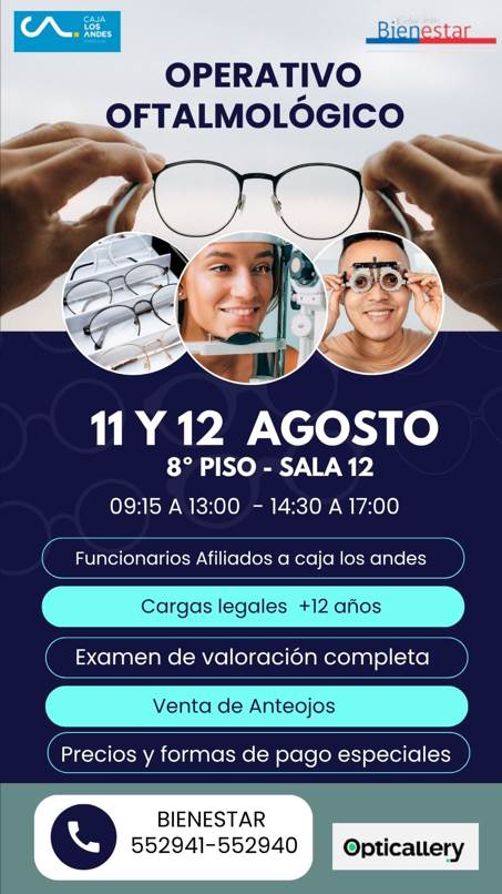 Junto con saludar, informamos que el próximo 11 y 12 de agosto entre las 09:15 y 17:00 horas se realizará un operativo oftalmológico coordinado por la unidad de bienestar.